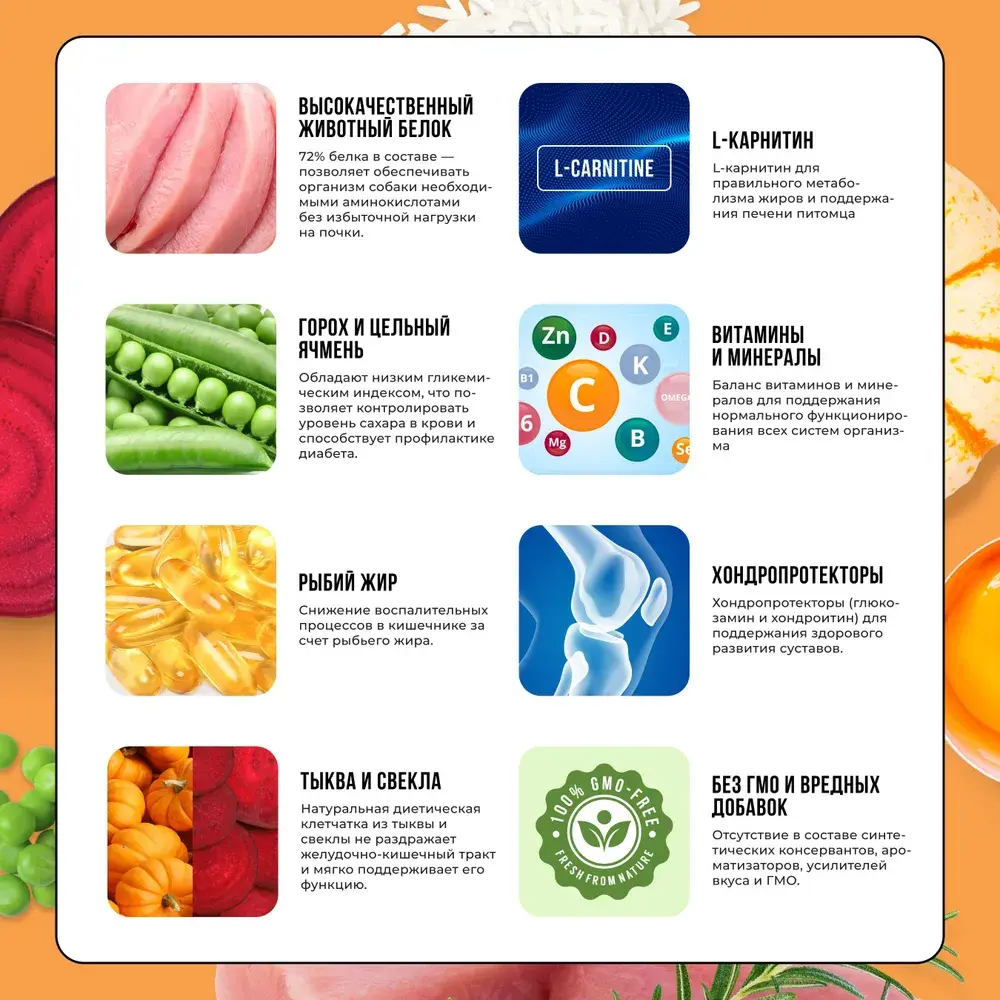 В его состав, помимо полного набора белков, жиров, углеводов, витаминов и микроэлементов, введены компоненты для поддержки иммунитета, суставов и заботы о здоровье кожи и шерсти вашего питомца.