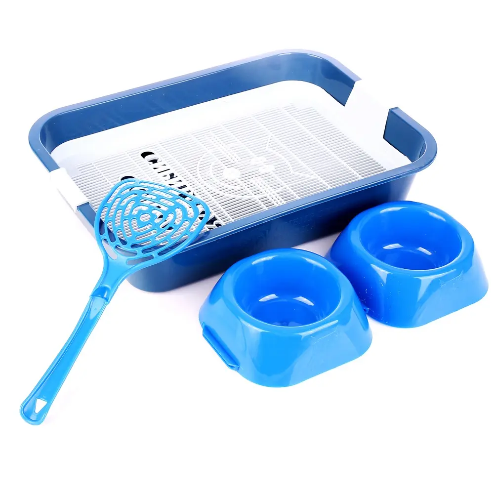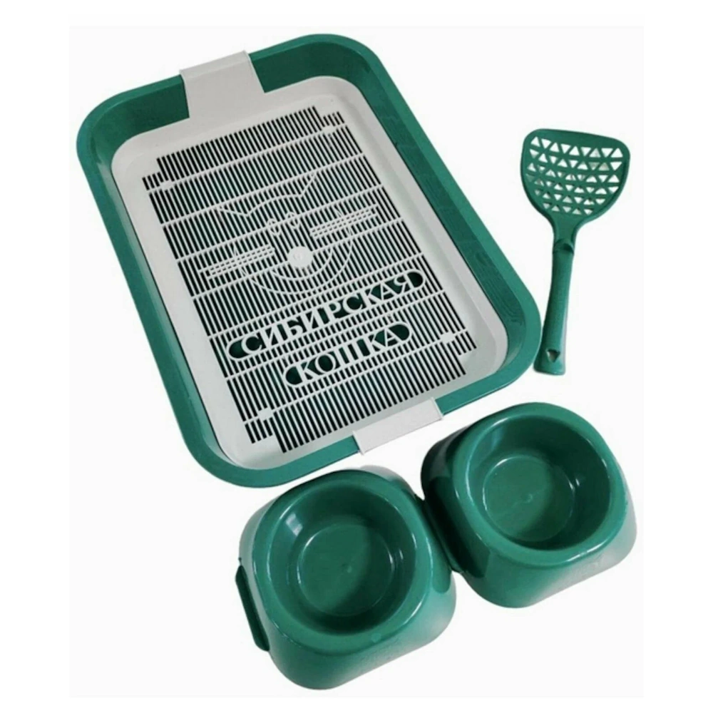 В комплект входят туалет лоток с сеткой, миска двойная и совок.