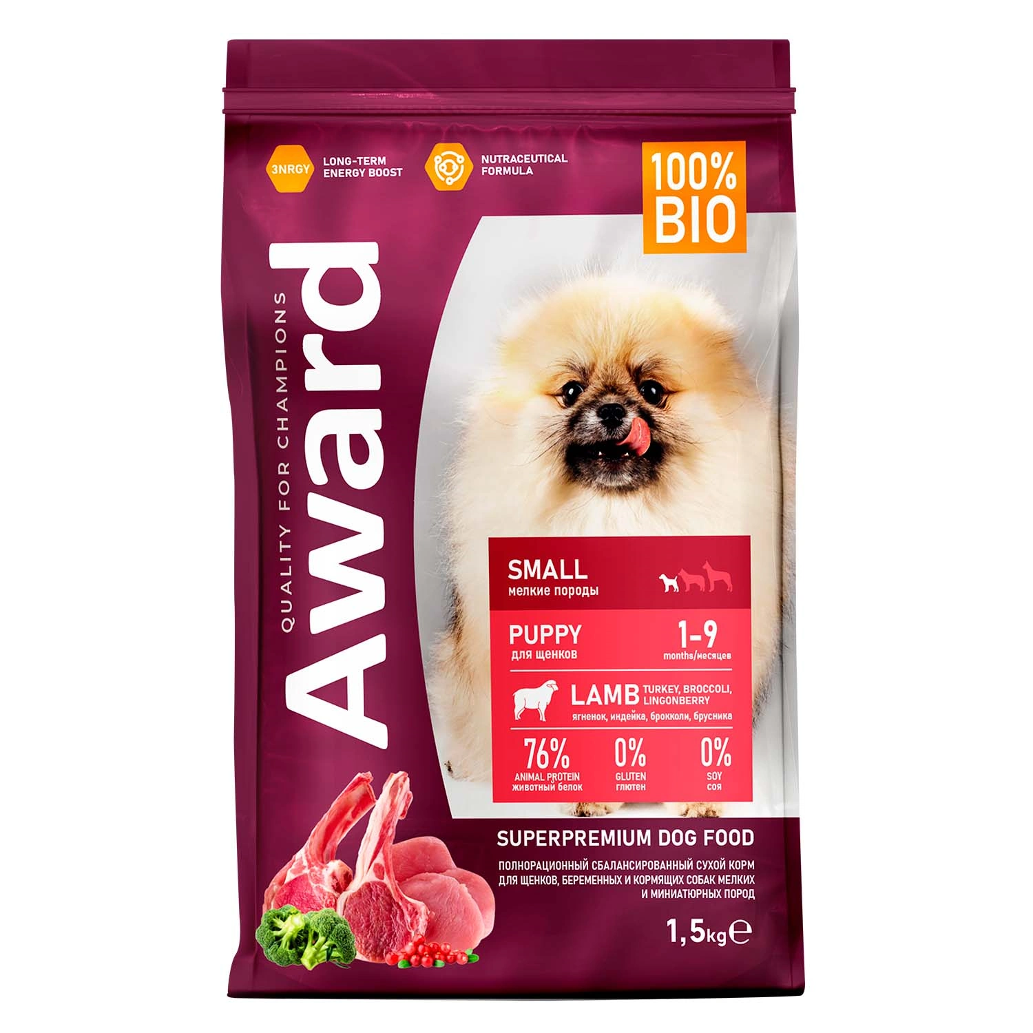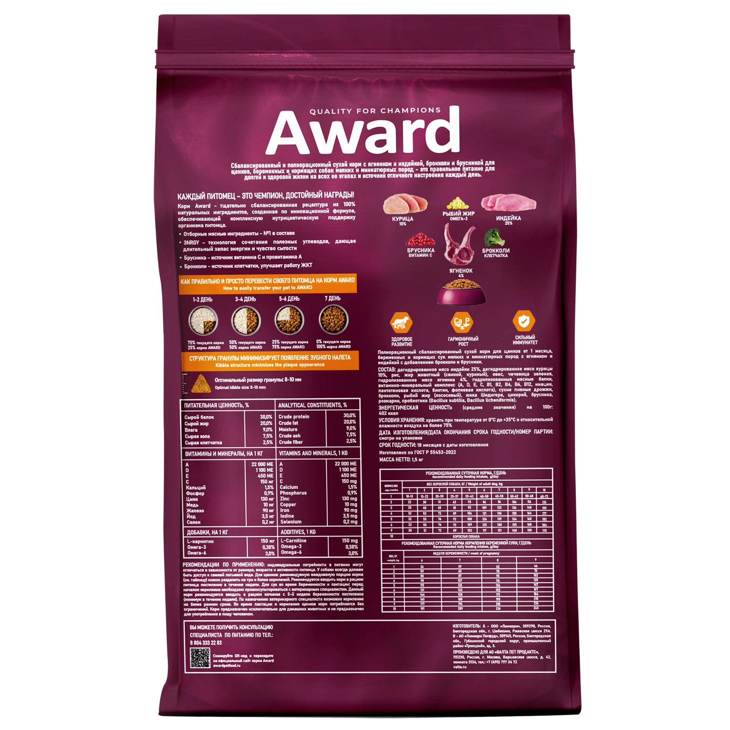 Сухой корм AWARD для щенков от 1 мес, беременных и кормящих сук мелких и миниатюрных пород с ягненком и индейкой с добавлением брокколи и брусники