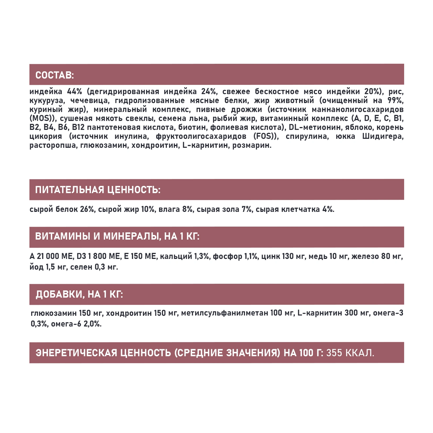 СОСТАВ: индейка 44% (дегидрированная индейка 24%, свежее бескостное мясо индейки 20%), рис, кукуруза, чечевица, гидролизованные мясные белки, жир животный (очищенный на 99%, куриный жир), минеральный комплекс, пивные дрожжи (источник маннанолигосахаридов (MOS)), сушеная мякоть свеклы, семена льна, рыбий жир, витаминный комплекс (A, D, E, C, B1, B2, B4, B6, B12 пантотеновая кислота, биотин, фолиевая кислота), DL-метионин, яблоко, корень цикория (источник инулина, фруктоолигосахаридов (FOS)), спирулина, юкка Шидигера, расторопша, глюкозамин, хондроитин, L-карнитин, розмарин.
