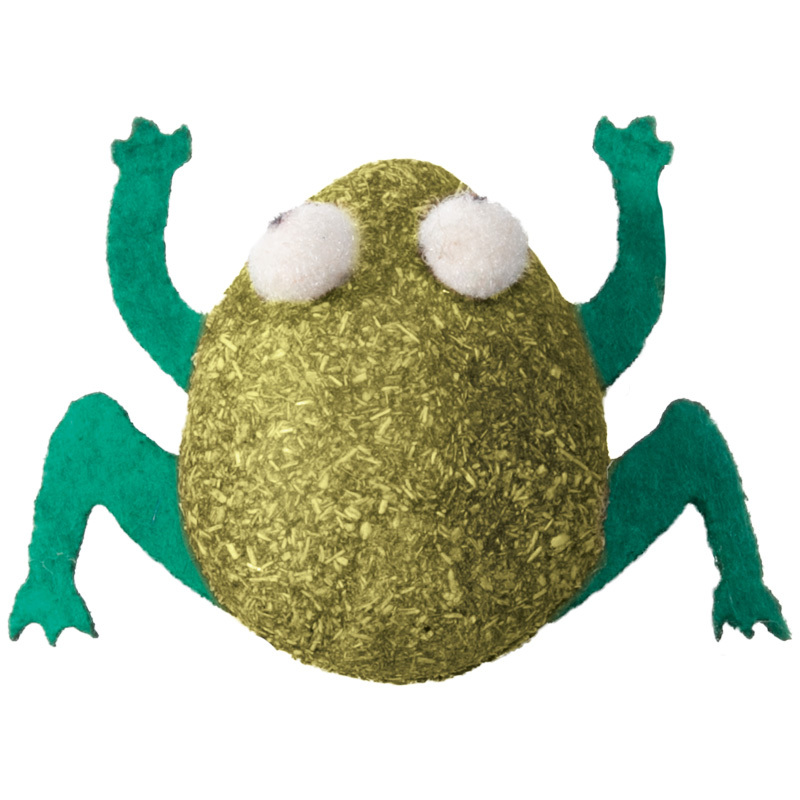 Изделие из спрессованной кошачьей мяты выполнено в виде лягушки с контрастными тканевыми лапками.