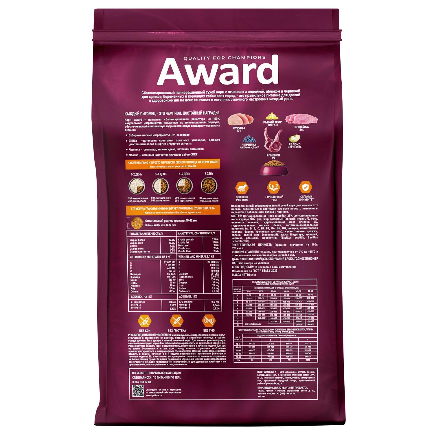 Сухой корм AWARD для щенков от 1 месяца, беременных и кормящих сук всех пород с ягненком и индейкой с добавлением яблока и черники