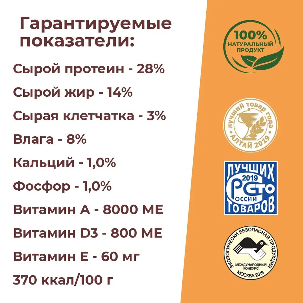 Показатели питательной ценности (средние значения): Сырой протеин 28%, Сырой жир 14%, Сырая клетчатка 3%, Кальций 1%, Фосфор 1%, Влага 8%