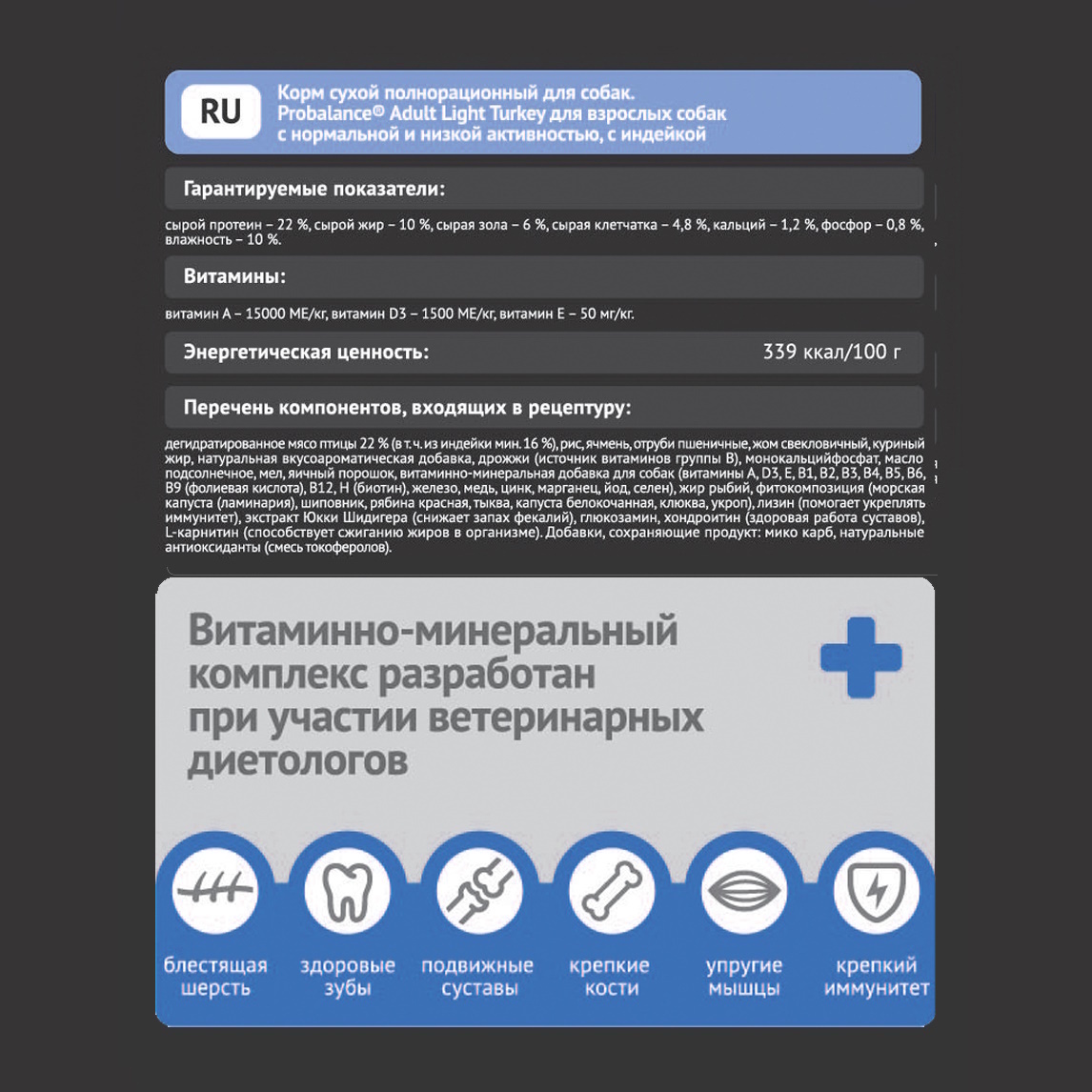 ГАРАНТИРУЕМЫЕ ПОКАЗАТЕЛИ: протеин – 22%, жир – 10%, зола – 6%, клетчатка – 5%, влажность – 10%, кальций – 1,2%, фосфор – 0,8%.