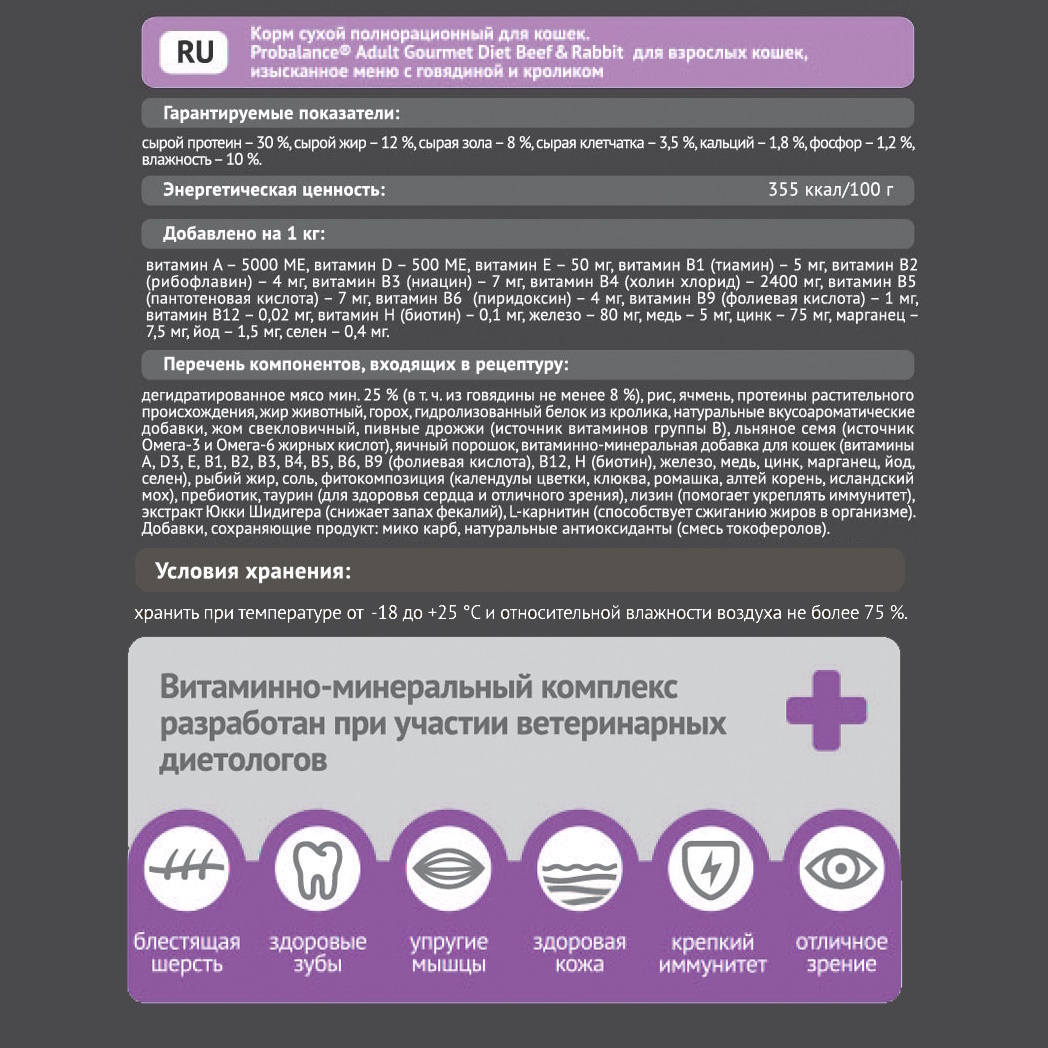 СОСТАВ: Дегидратированное мясо мин. 25% (в т. ч. из говядины не менее 8%), рис, ячмень, протеины растительного происхождения, жир животный, горох, гидролизованный белок из кролика, натуральные вкусоароматические добавки, жом свекловичный, пивные дрожжи (источник витаминов группы В), льняное семя (источник Омега-3 и Омега-6 жирных кислот), яичный порошок, витаминно-минеральная добавка для кошек (витамины А, D3, Е, В1, В2, В3, В4, В5, В6, В9 (фолиевая кислота), В12, Н (биотин), железо, медь, цинк, марганец, йод, селен), рыбий жир, соль, фитокомпозиция (календулы цветки, клюква, ромашка, алтей корень, исландский мох), пребиотик, таурин (для здоровья сердца и отличного зрения), лизин (помогает укреплять иммунитет), экстракт Юкки Шидигера (снижает запах фекалий), L-карнитин (способствует сжиганию жиров в организме). Добавки, сохраняющие продукт: микокарб, натуральные антиоксиданты (смесь токоферолов).
