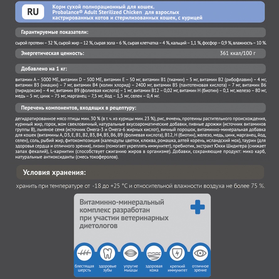 Уценка! Повр.упак. / Сухой корм ProBalance Sterilized для кастрированных котов и стерилизованных кошек с курицей - купить в ЗооГастроном, доставка по России