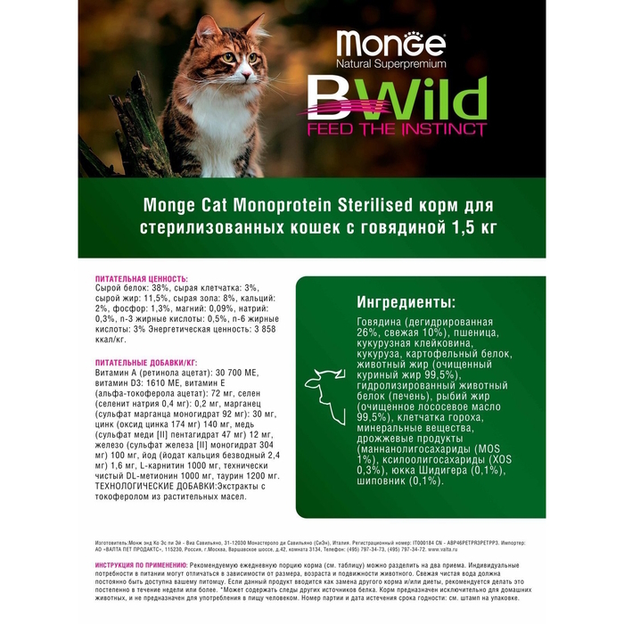 Сухой корм Monge Cat Speciality Line Monoprotein Sterilised для стерилизованных кошек, из говядины