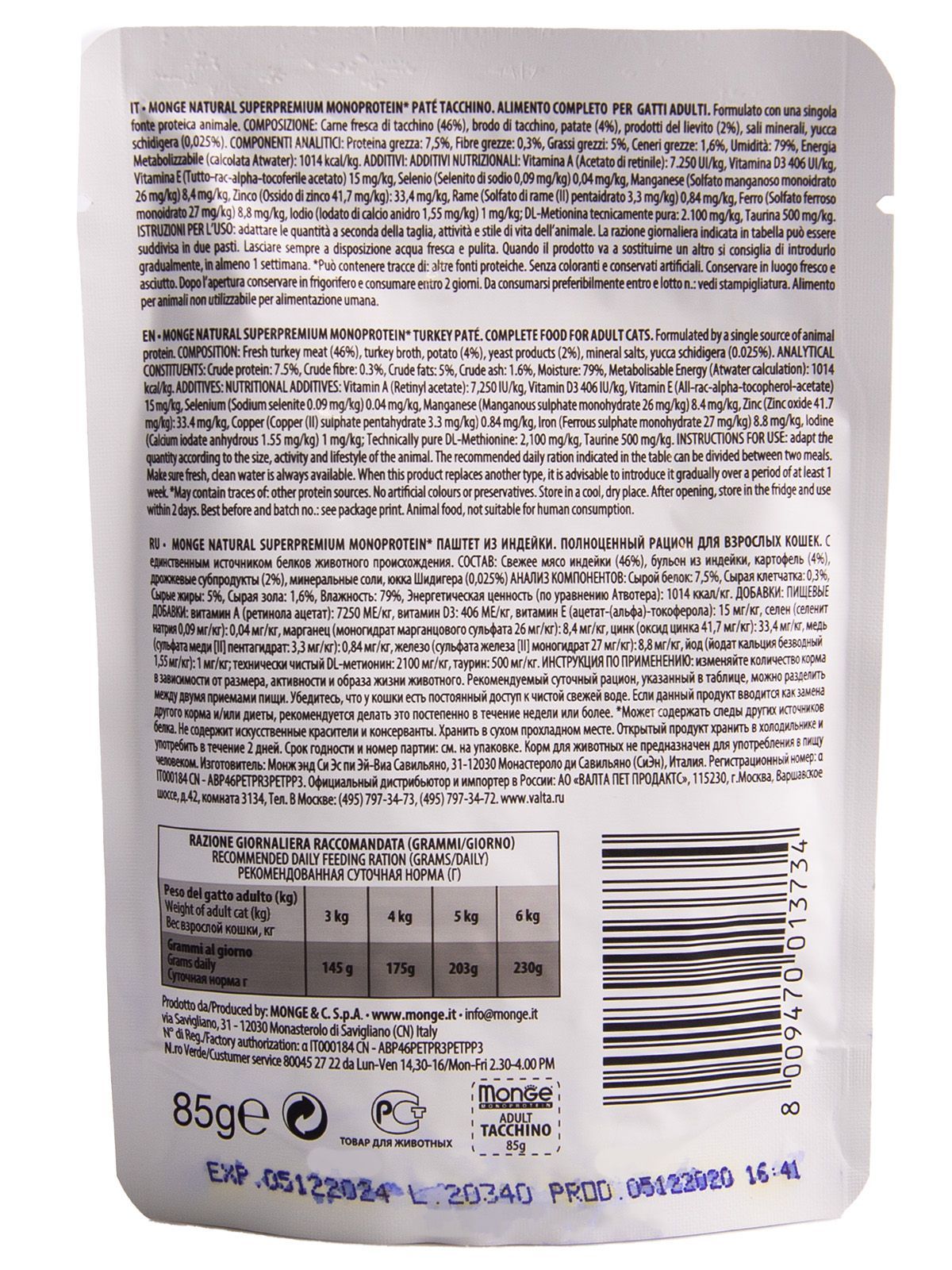 Monge (Монж/Монже) Cat Monoprotein (Монопротеин) Pouch паучи для взрослых кошек и котов индейка 85г - это полноценный сбалансированный рацион из мяса индейки для взрослых кошек и котов с особыми потребностями.