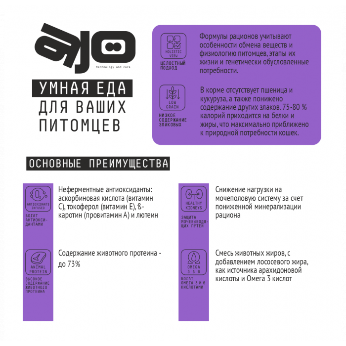 Для правильного питания кошек и поддержания здоровья питомцев необходимо полезное и качественное питание, а также обеспечение организма кошек с чувствительным пищеварением легкоперевариваемым белком, нормализует работу ЖКТ и поддерживает оптимальную микрофлору кишечника. Поэтому сухой корм AJO (Айо) разработан с учетом всех этих особенностей, содержит все необходимые питательные вещества.
