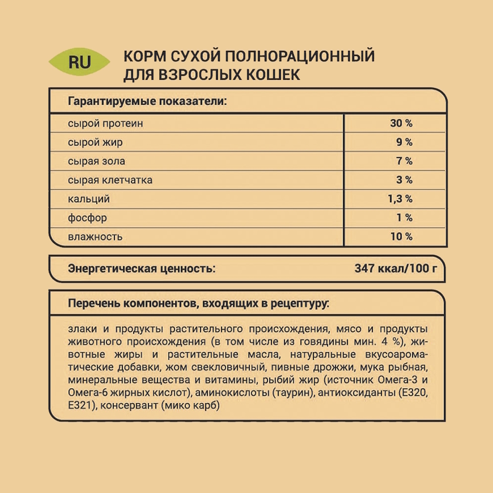СОСТАВ: Злаки и продукты растительного происхождения, мясо и продукты животного происхождения (в том числе из говядины мин. 4%), животные жиры и растительные масла, натуральные вкусоароматические добавки, жом свекловичный, пивные дрожжи, мука рыбная, минеральные вещества и витамины, рыбий жир, аминокислоты (таурин), антиоксиданты, консервант. Энергетическая ценность: 347 ккал / 100 г