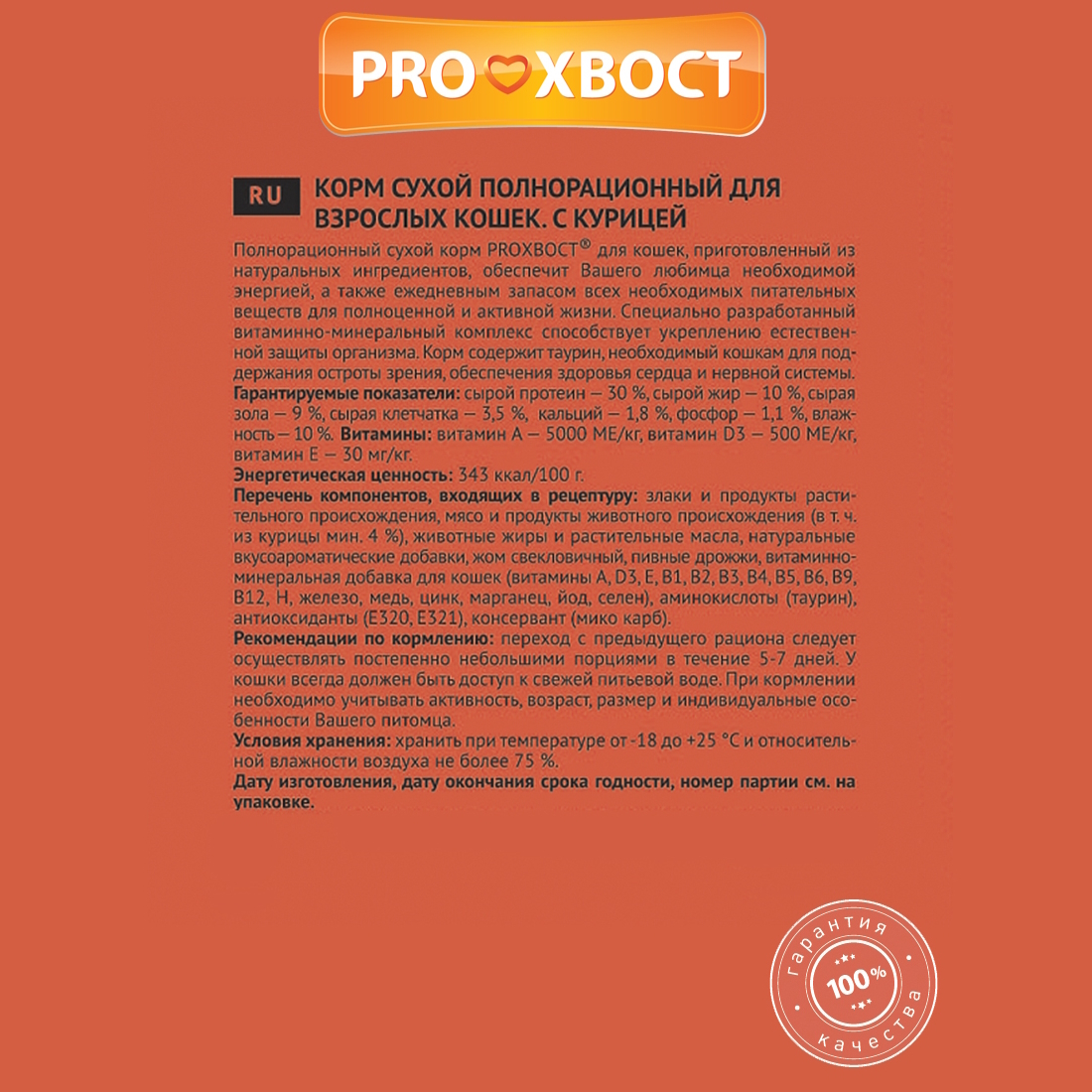 Сухой корм Proхвост ("Прохвост") с курицей разработали датские специалисты по кормлению животных. В рецепт вошли натуральные продукты: мясо, злаки и овощи. Они в обязательном порядке должны присутствовать в ежедневном рационе кошки, так как от них зависит здоровье и активность. В отличие от еды со стола человека в корме соблюден правильный баланс питательных элементов, витаминов и минералов. В сухом рационе их ровно столько, сколько требуется организму кошки.