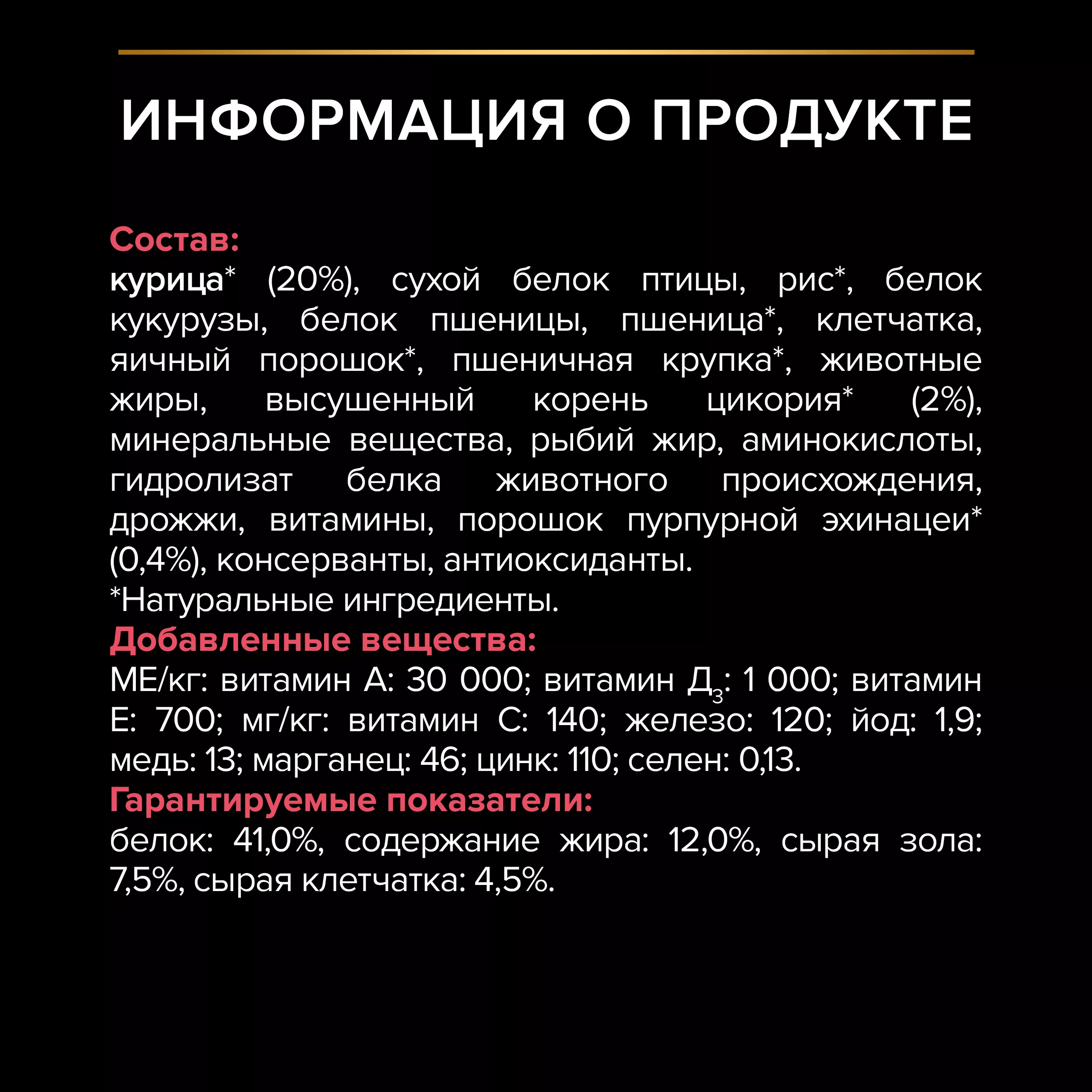 Состав: курица высокого качества* (20%, включая спинку и грудку), сухой белок птицы, рис*, белок кукурузы, белок пшеницы, пшеница*, пшеничная крупка*, высушенная мякоть свеклы, яичный порошок*, животные жиры, высушенный корень цикория* (2%), минеральные вещества, рыбий жир, гидролизат белка животного происхождения, консерванты, дрожжи, аминокислоты, витамины, порошок эхинацеи пурпурной* (0,4%), антиоксиданты. * Натуральные ингредиенты