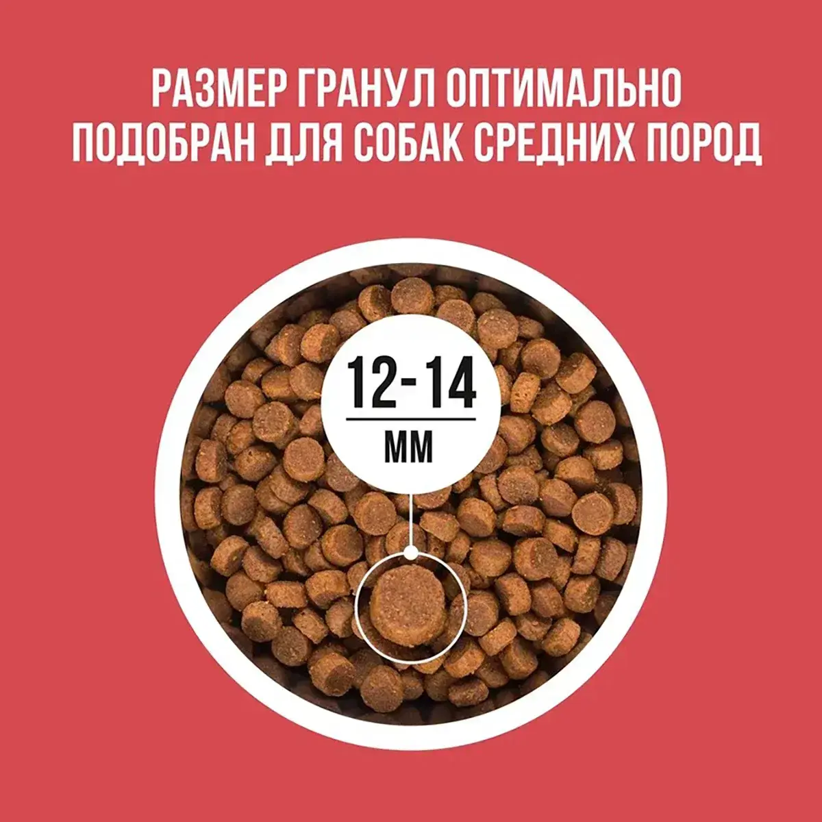 Размер гранул 12–14 мм специально разработан для взрослых собак средних пород.