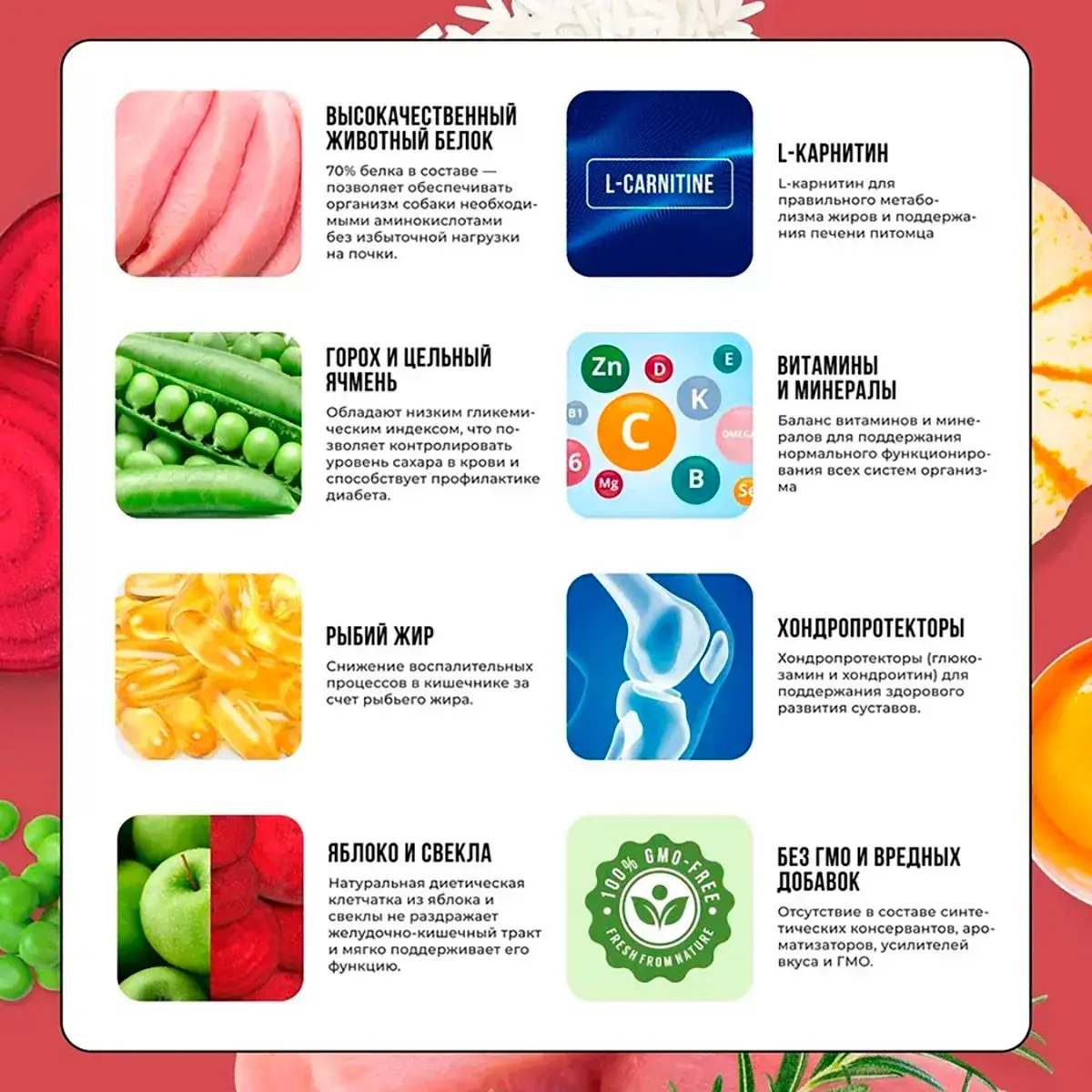 В его состав, помимо полного набора белков, жиров, углеводов, витаминов и микроэлементов, введены компоненты для поддержки иммунитета, суставов и заботы о правильном пищеварении вашего питомца.