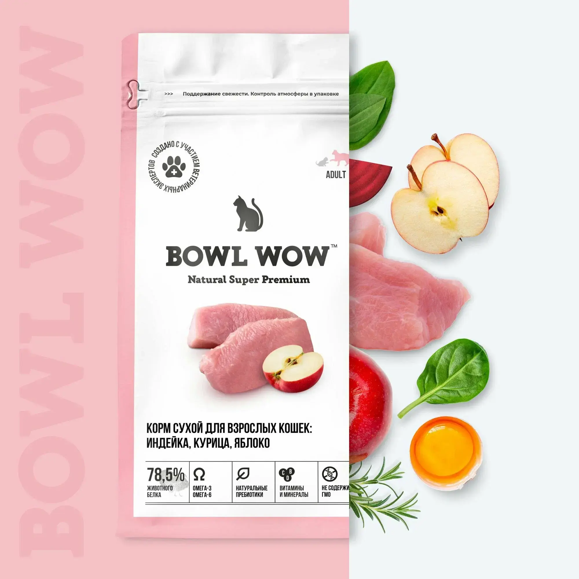 Сухой корм BOWL WOW для взрослых кошек с индейкой и яблоком