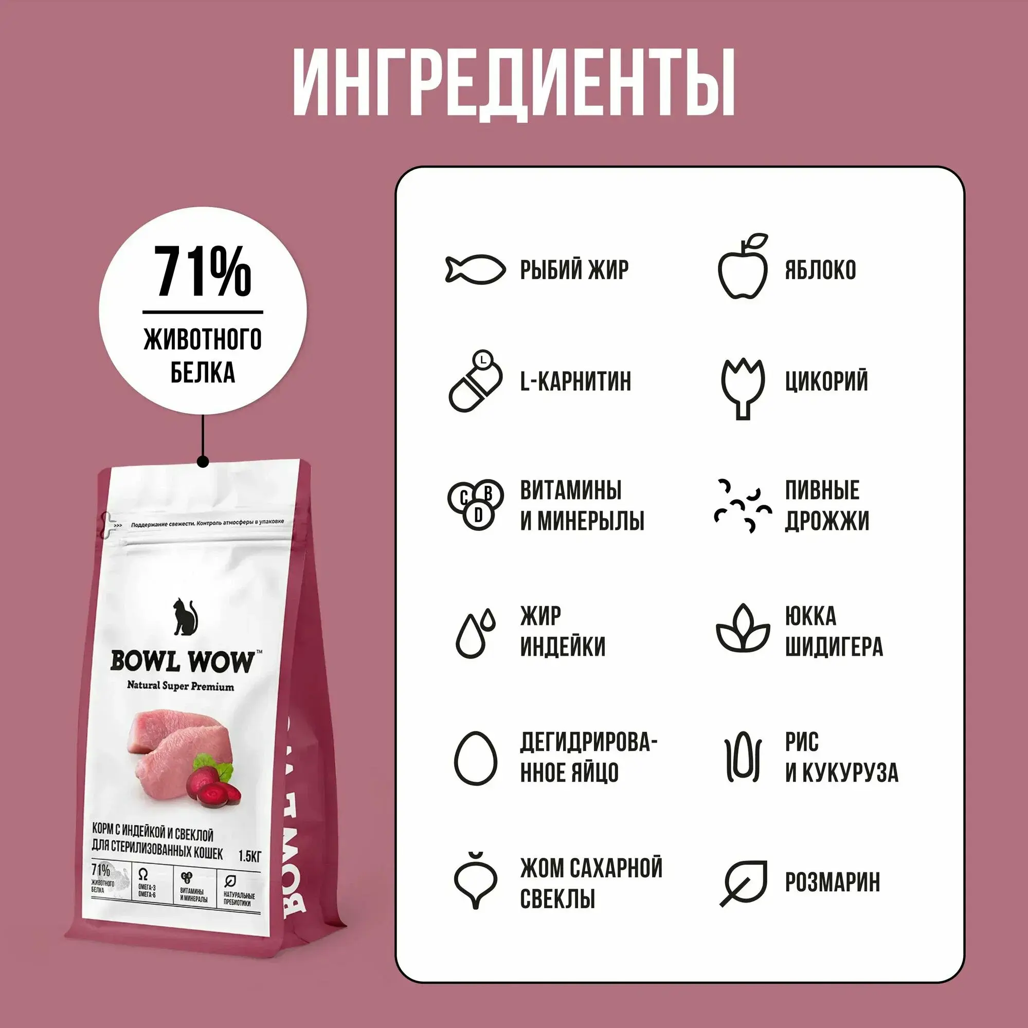 Полнорационный корм BOWL WOW с индейкой, курицей и свеклой предназначен для взрослых стерилизованных кошек.