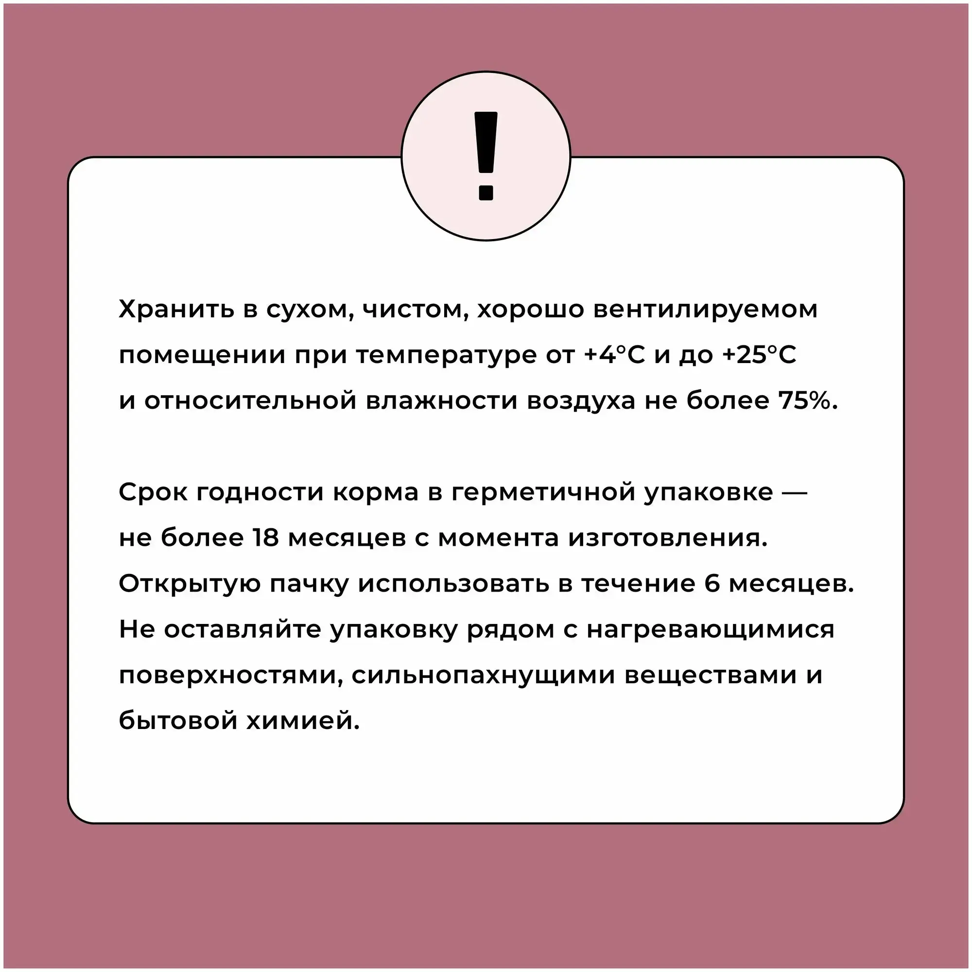 - Соответствует нормам по кормам FEDIAF, NRC и российскому ГОСТу Р 55453-2022.