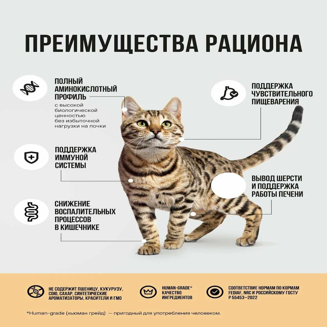 - Собственная рецептура: не менее 88% мясных ингредиентов human-grade качества в каждом кусочке с высокой усвояемостью белка 73% (технология BVaap). Полноценный аминокислотный профиль для вашего питомца без избыточной нагрузки на почки.