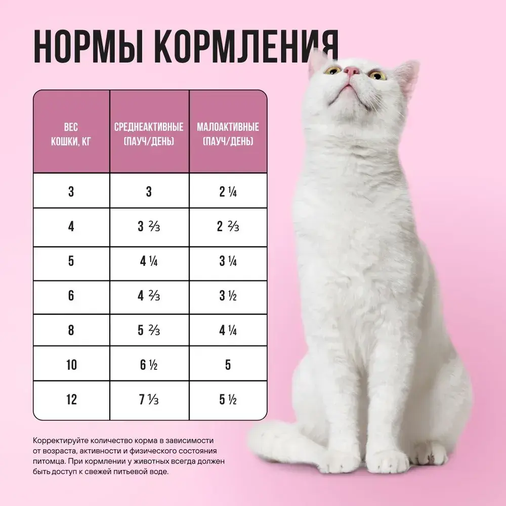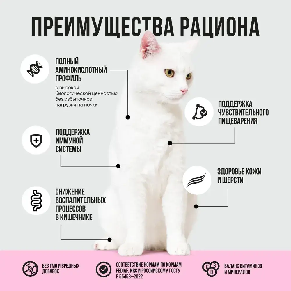 • Соответствие нормам по кормам FEDIAF, NRC и российскому ГОСТу Р 55453-2022.