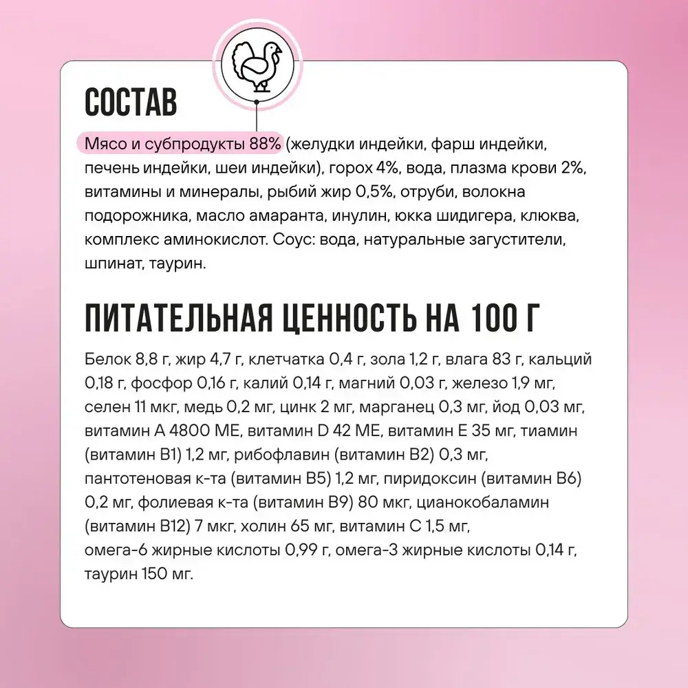 Состав: мясо и субпродукты 88 % (желудки индейки, фарш индейки, печень индейки, шеи индейки), горох 4 %, вода, плазма крови 2 %, витамины и минералы, рыбий жир 0,5 %, отруби, волокна подорожника, масло амаранта, инулин, юкка шидигера, клюква, комплекс аминокислот. Соус: вода, натуральные загустители, шпинат, таурин.