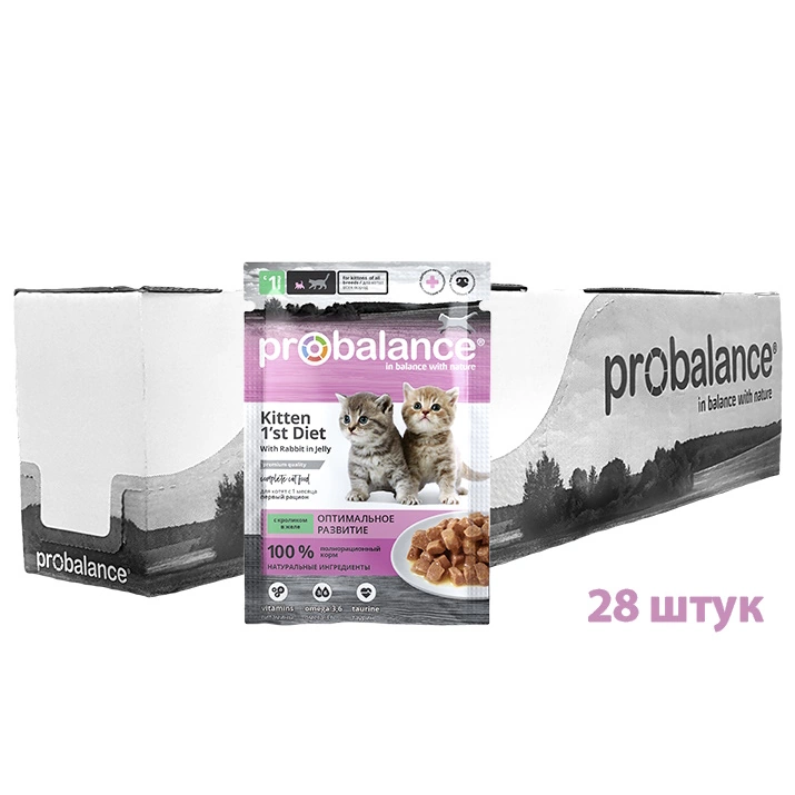 В состав консервированного корма ProBalance "Kitten 1`st diet" входит кролик, который считается диетическим мясом. Это источник железа, меди, витаминов и микроэлементов, которые необходимы для полноценного развития и роста котенка. Природные антиоксиданты, содержащиеся в кусочках мяса, способствуют укреплению иммунитета.