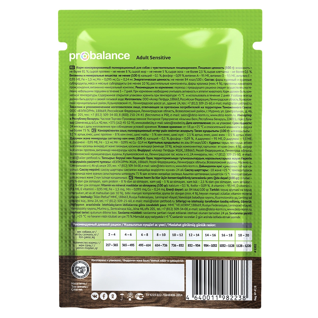 Мягкие сочные кусочки в соусе нравятся питомцам и, как правило, съедаются без остатка. Корм Probalance "Sensitive" предельно сбалансирован и покрывает суточную потребность собаки в питательных веществах, минералах и витаминах. Упаковка 100 грамм рассчитана на одно кормление собаки мелкой и средней породы, что облегчает хозяину дозировку корма.