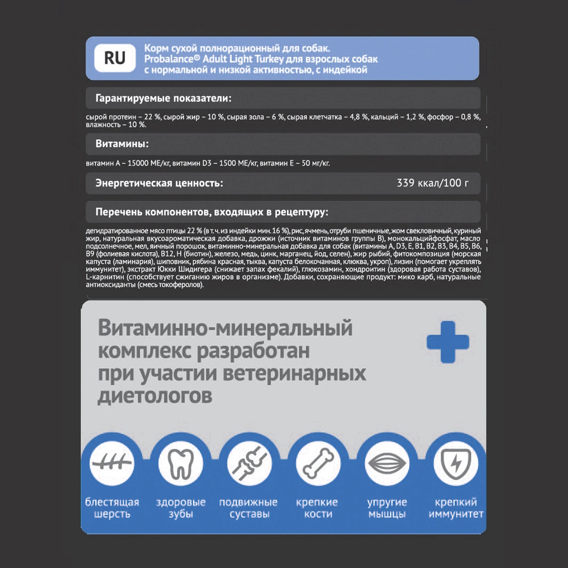 ГАРАНТИРУЕМЫЕ ПОКАЗАТЕЛИ: протеин – 22%, жир – 10%, зола – 6%, клетчатка – 5%, влажность – 10%, кальций – 1,2%, фосфор – 0,8%.
