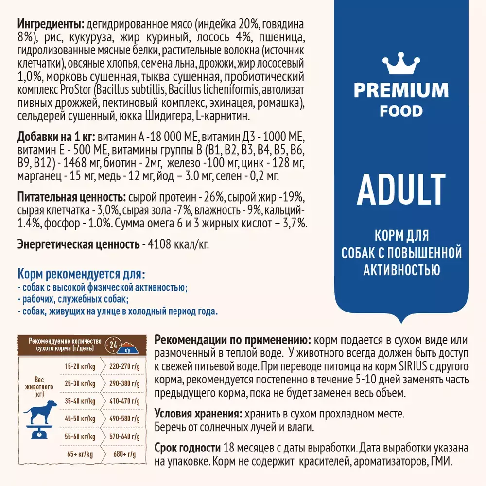 SIRIUS - сухой корм премиум класса для полноценного ежедневного рациона взрослых собак с повышенной активностью.
